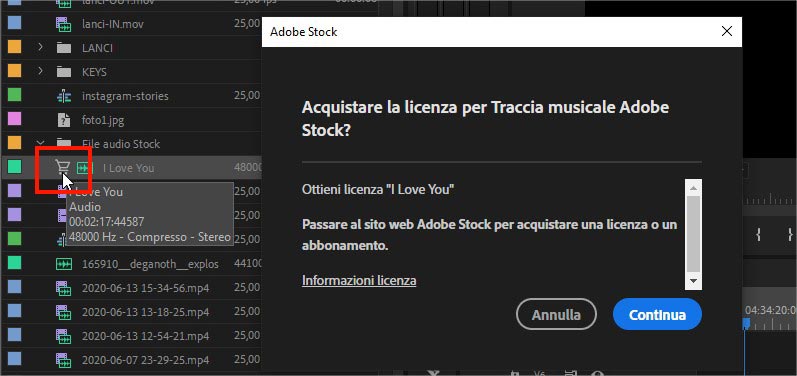 Dopo aver individuato il brano musicale di nostro interesse Premeire permette di testarlo direttamente nella timeline. Quando siamo soddisfatti e convinti di voler procedere con l’acquisto dei diritti d’utilizzo basta fare click sull’icona del carrello. Dopo aver concluso positivamente il pagamento Premeire scaricherà in automatico l’audio ad alta qualità e sostituirà automaticamente il metraggio.