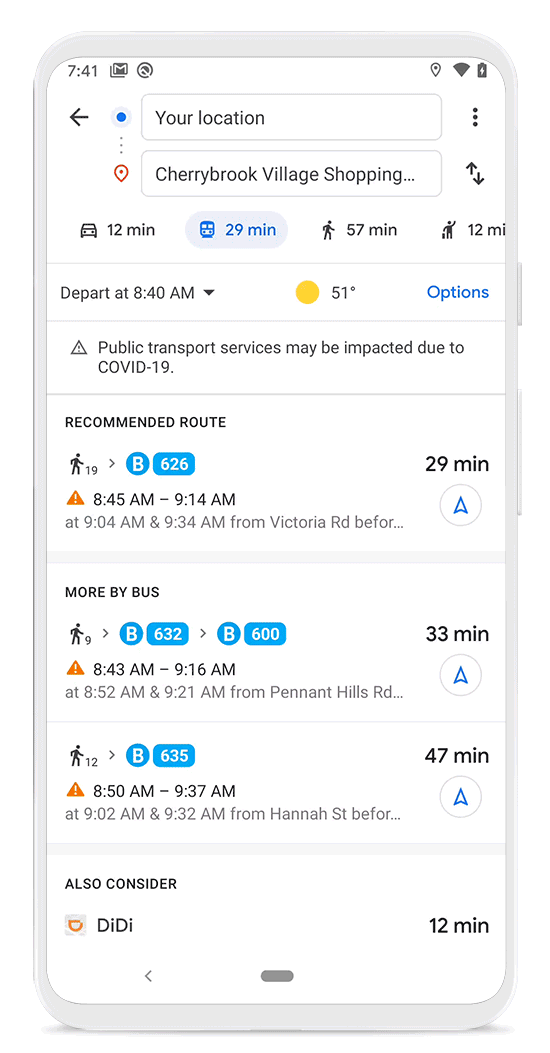 Nella nostra ultima release di Google Map per Android e iOS stiamo introducendo funzionalità per aiutarti ad avere informazioni importanti se devi uscire, sia se decidi di andare in macchina sia se decidi di muoverti con il tasporto pubblico.