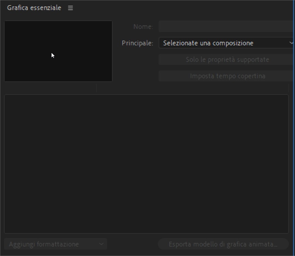 - Aprire il pannello della grafica essenziale andando in Finestra > Grafica Essenziale. Il pannello comparirà di default sulla sinistra del monitor di anteprima