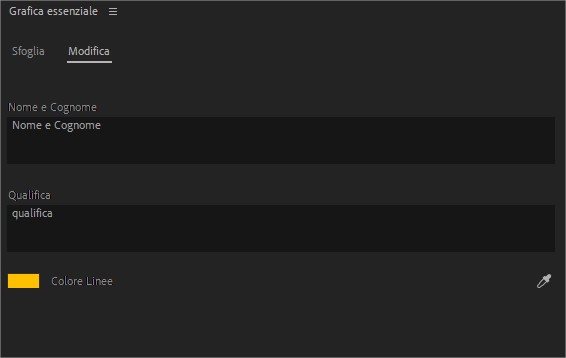 Come potete vedere nell’immagine in After Effects posso specificare quali parametri lasciar modificare al montatore video. Nell’esempio il montatore video potrà modificare in Premiere Pro il testo del Nome e Cognome, la qualifica e il colore delle linee verticali accanto al sottopancia. Vediamo ora nel dettaglio come fare.