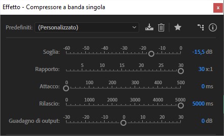 Questo è un corso dedicato ad Adobe Premiere Pro e molti si domanderanno: come può essere d’aiuto un compressore audio nelle produzioni video? Immaginate una conferenza di 4 ore. Immaginate di non avere il tempo di riascoltarla minuto per minuto e di voler omogeneizzare il più possibile i discorsi dei vari relatori. In questo caso il compressore audio può fare la differenza. Non solo. Adobe Premiere Pro ha un compressore avanzato (chiamato compressore multibanda) di cui parleremo meglio in un prossimo tutorial. Il compressore multibanda di Adobe Premiere Pro ha degli ottimi preset che aiutano a migliorare un audio poco omogeneo.