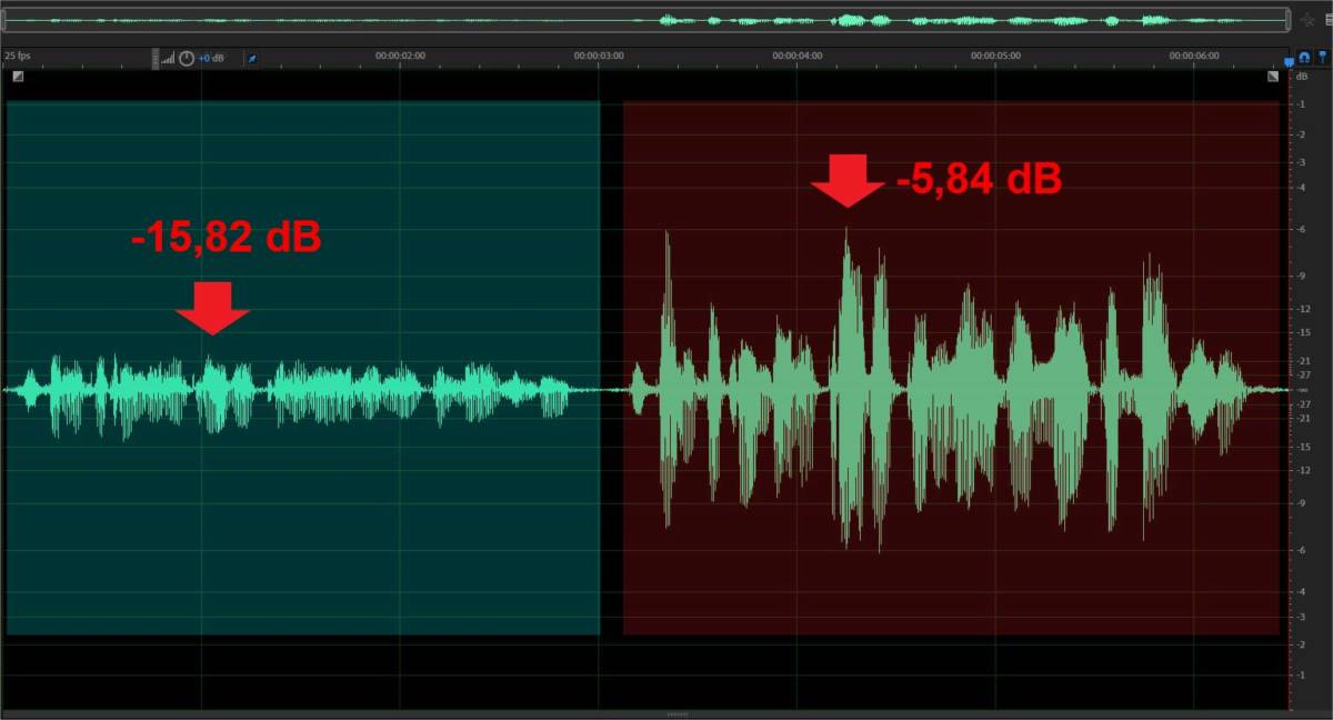 Cosa fa il compressore audio? Già il nome suggerisce la risposta! Il compressore audio…comprime! Una spiegazione così sicuramente non avrà aiutato nessuno. Facciamo quindi ricorso ad un’illustrazione per comprendere la funzione di questo strumento molto utilizzato sia nelle grandi produzioni video sia, ovviamente, nelle produzioni musicali. Guardate attentamente l’immagine seguente e notate come la forma d’onda che stiamo prendendo in considerazione abbia una dinamica molto ampia (il primo blocco ha un volume più basso, con picco a -15,82 dB; il secondo ha un volume più alto, con un picco a -5,84 dB)
