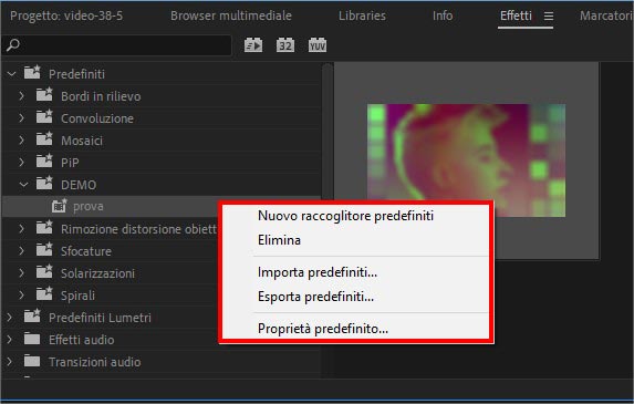 La procedura per importare un effetto predefinito in Adobe Premiere 2019 è identica a quella che abbiamo visto ma invece di scegliere la voce “esporta predefinito” occorre scegliere la voce “importa predefinito”.