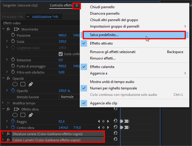 Creare e salvare un effetto predefinito in Adobe Premiere è davvero molto semplice. Innanzi tutto selezionate, nel pannello controllo effetti, tutti gli effetti che volete includere nel vostro predefinito. Fatta questa operazione cliccate con il tasto sinistro del mouse sul bottone delle impostazioni del pannello e cliccate sulla voce “Salva predefinito…“