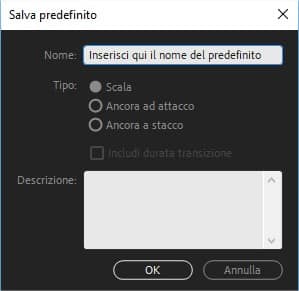 A questo punto si aprirà una finestra nella quale potrete dare un nome al vostro preset e decidere come gestire la presenza di eventuali key frame. Avete infatti tre possibilità di scelta: