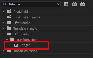 Come già abbiamo visto quando abbiamo parlato degli effetti video e audio in Adobe Premiere, tutti gli effetti installati e disponibili sulla nostra workstation possono essere trovati nel pannello “effetti”. Sotto la cartella “Effetti video” individuate la sottocartella “Trasformazione”. Questo è lo strumento che utilizzeremo nel video tutorial di oggi.