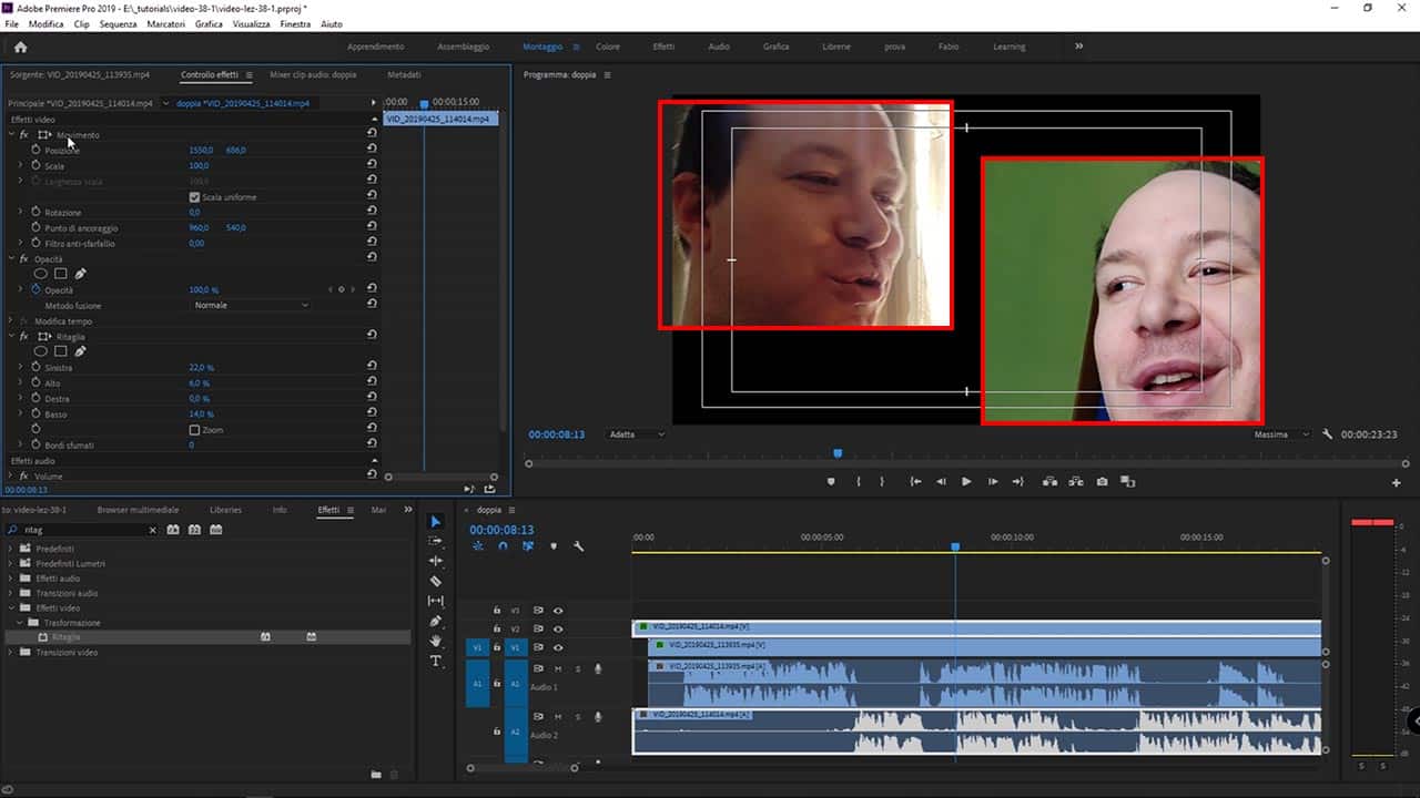 Esempio pratico: ritagliare due video, posizionarli uno vicino all’altro, e creare l’effetto “intervista doppia”