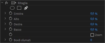 Nel pannello “controllo effetti”, in basso, troverete l’effetto ritaglia, appena aggiunto. Questo effetto, come detto, è molto semplice e intuitivo da utilizzare: ha solo quattro valori: