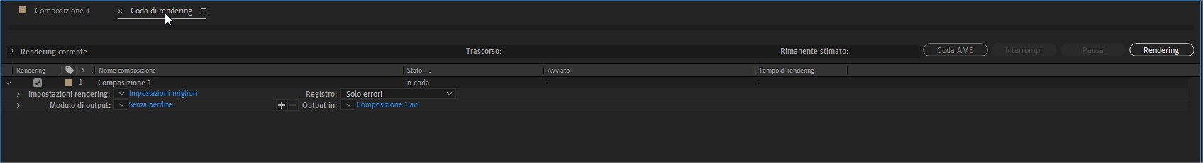 Una volta impostati tutti i parametri desidera possiamo premere sul bottone Rendering (sulla destra del pannello coda di rendering) per avviare l’export.