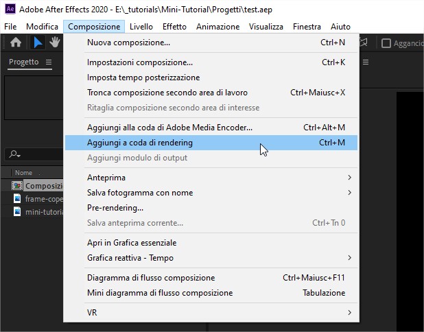 Come esportare da Adobe After Effects: aggiungi a coda di rendering