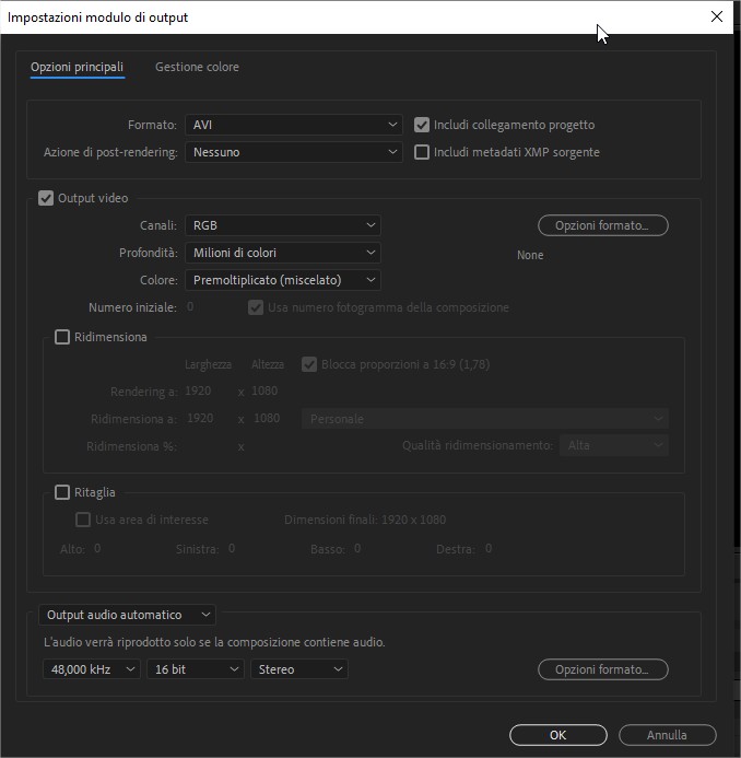 Cliccando su Modulo di Output (sulla scritta in azzurro sulla destra) potremo aprire il Modulo di Output in cui andremo ad impostare le caratteristiche che dovrà avere il file che stiamo esportando.