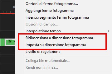 Queste due funzioni possono essere utilizzate selezionando la clip che si vuole ridimensionare nella timeline, cliccandoci sopra con il tasto destro del mouse e scegliendo dal menu contestuale che compare la voce “imposta a dimensione fotogramma” o “ridimensiona a dimensione fotogramma”. Lo scopo di entrambe le funzioni è lo stesso: scalare la clip in modo da renderla grande come il frame della sequenza ma prestate molta attenzione, hanno effetti diversi sull’oggetto multimediale coinvolto nell’operazione e occorre sapere cosa si sta facendo. Vediamo nel dettaglio come funzionano e quando scegliere l’una o l’altra.