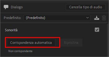 - Per far sì che Premiere calcoli il livello medio del volume della clip espandiamo la tab “Sonorità”. Clicchiamo quindi sul bottone “Corrispondenza Automatica”
