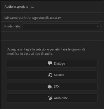 Come potete vedere la struttura del pannello è abbastanza minimale. In alto viene indicato il nome della clip audio a cui gli effetti saranno applicati. Poi viene data la possibilità di scegliere fra alcuni preset (predefiniti) preparati da Adobe per gli usi più generali. Infine possiamo trovare quattro bottoni che ci permettono di assegnare alla clip segnalata uno status a seconda della tipologia di segnale sonoro a cui stiamo lavorando. Dialogo: come detto serve per le voci. per le conversazioni, per gli speach. Musica: deve essere applicato a tutti gli elementi musicali che vogliamo contrassegnare come la nostra soundtrack; SFX: sono gli effetti sonori, frammenti sonori utili per sottolineare, ad esempio, una transizione; Ambiente: sono tutti quei suono che descrivono un ambiente (rumore di strada, di una caffetteria etc…). Per applicare uno “status” ad una clip è sufficiente cliccare con il tasto sinistro del mouse sopra la categoria desiderata.