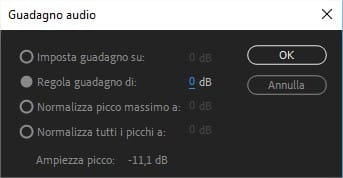 Come potete vedere Premiere ci permette di fare diverse cose con questo pannello, non solo modificare il guadagno audio ma anche applicare la normalizzazione. Viene inoltre fornita un’informazione molto preziosa da imparare ad osservare quando si vuole modificare il volume di una clip: l’ampiezza di picco. (guarda la lezione sull’audio digitale per comprendere i concetti e i termini base).