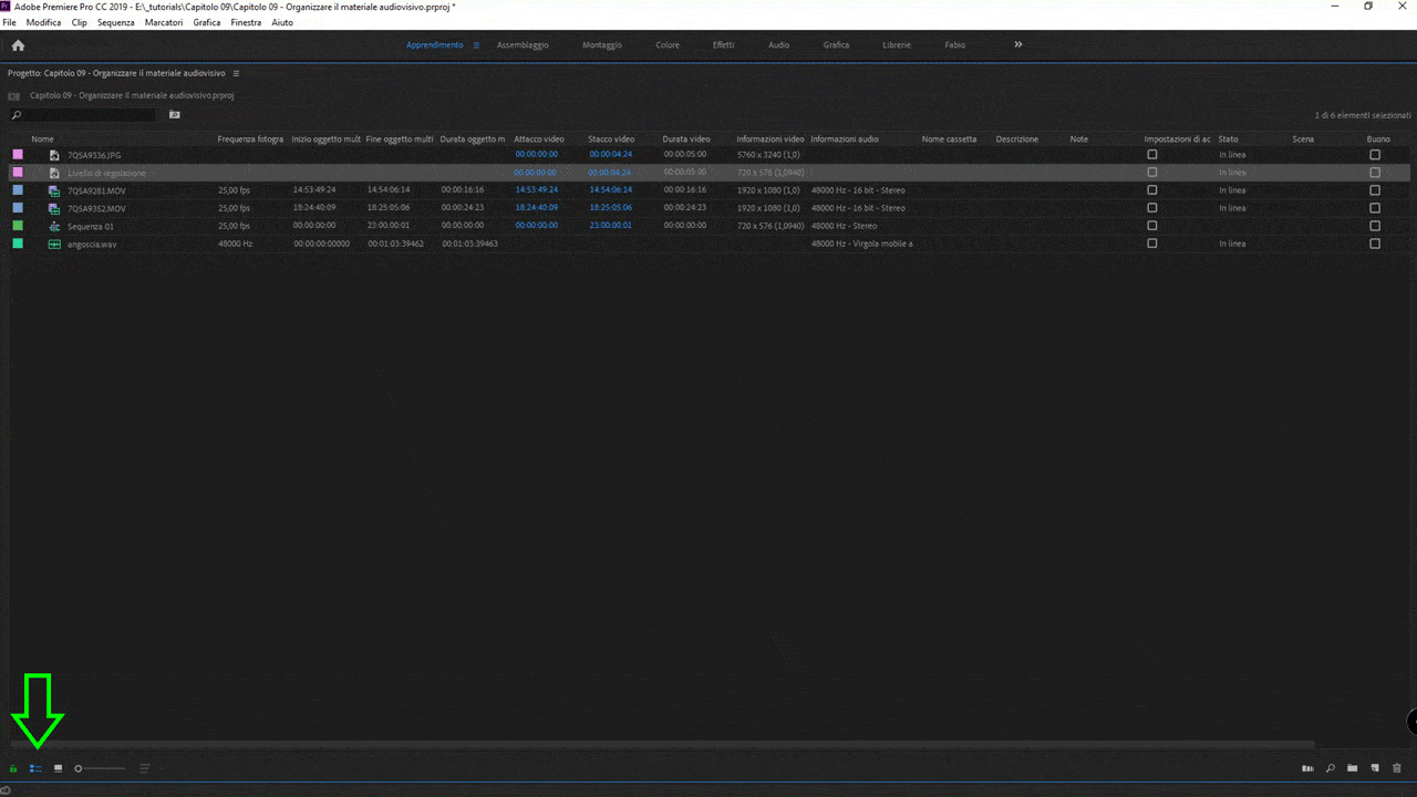 Ecco una breve sintesi delle principali opzioni di visualizzazione del pannello progetto in Adobe Premiere 2019