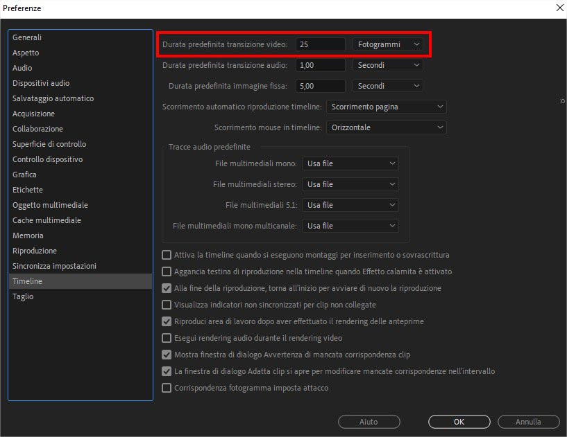 In Adobe Premiere è possibile modificare la durata di una transizione in due momenti ben precisi: prima dell’inserimento e dopo l’inserimento. Di default la durata di una transizione è impostata a 25 fotogrammi (quindi, se si lavora in una timeline configurata per lavorare a 25 fotogrammi per secondo, queste dureranno esattamente un secondo). Modificando le preferenze (dal menu Modifica > Preferenze > Timeline) è possibile personalizzare la durata.