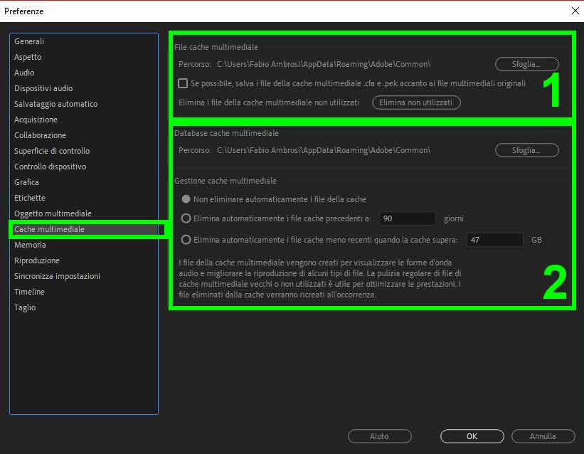 Bisogna sapere che per velocizzare la gestione di file di grandi dimensioni Adobe Premiere utilizza un sistema di Cache (vale a dire file temporanei di appoggio che aiutano l’applicazione a girare in maniera più fluida e veloce). Questi file di cache (chiamati “cache multimediale”) devono essere configurati in maniera tale da non interferire con le normali operazioni del computer.