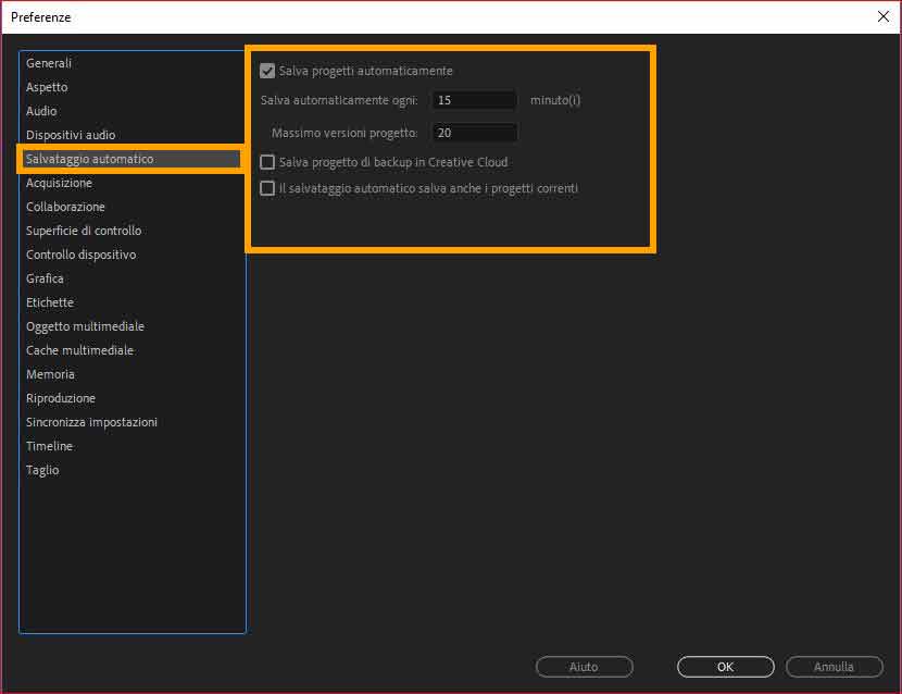 Preferenze e settaggi: salvataggi automatici in Premiere e file di Backup