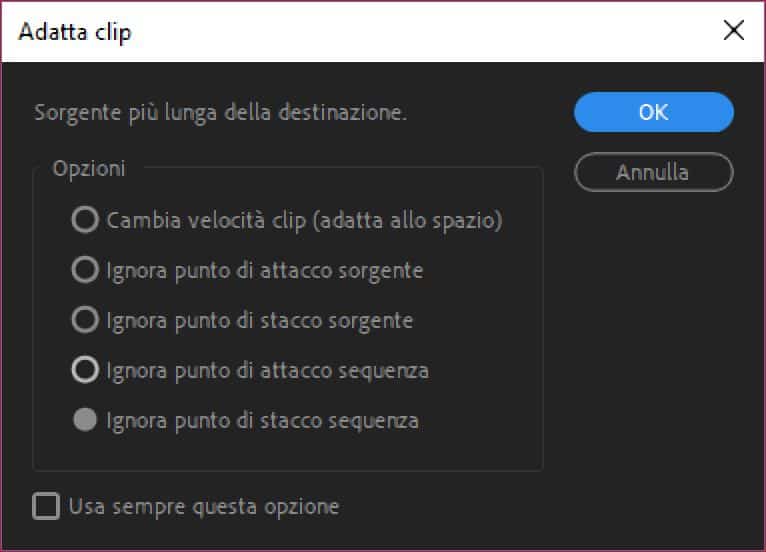 • Ignora punto di stacco sorgente – Adobe Premiere inserirà la clip ignorando questa volta l’OUT della clip sorgente. Partendo dall’IN Premiere inserirà la clip fino a riempire lo spazio disponibile in timeline;