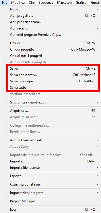La funzione “Salva una copia” è identica alla modalità di salvataggio “Salva con nome” ma Premiere salverà una copia aggiungendo il suffisso “copia” e, se serve, un numero progressivo, alla fine del file. Questo modo di salvare può essere un’alternativa al “Salva con nome” a patto che non esageriate. Il tasto di scelta rapida è Ctrl + Alt + S