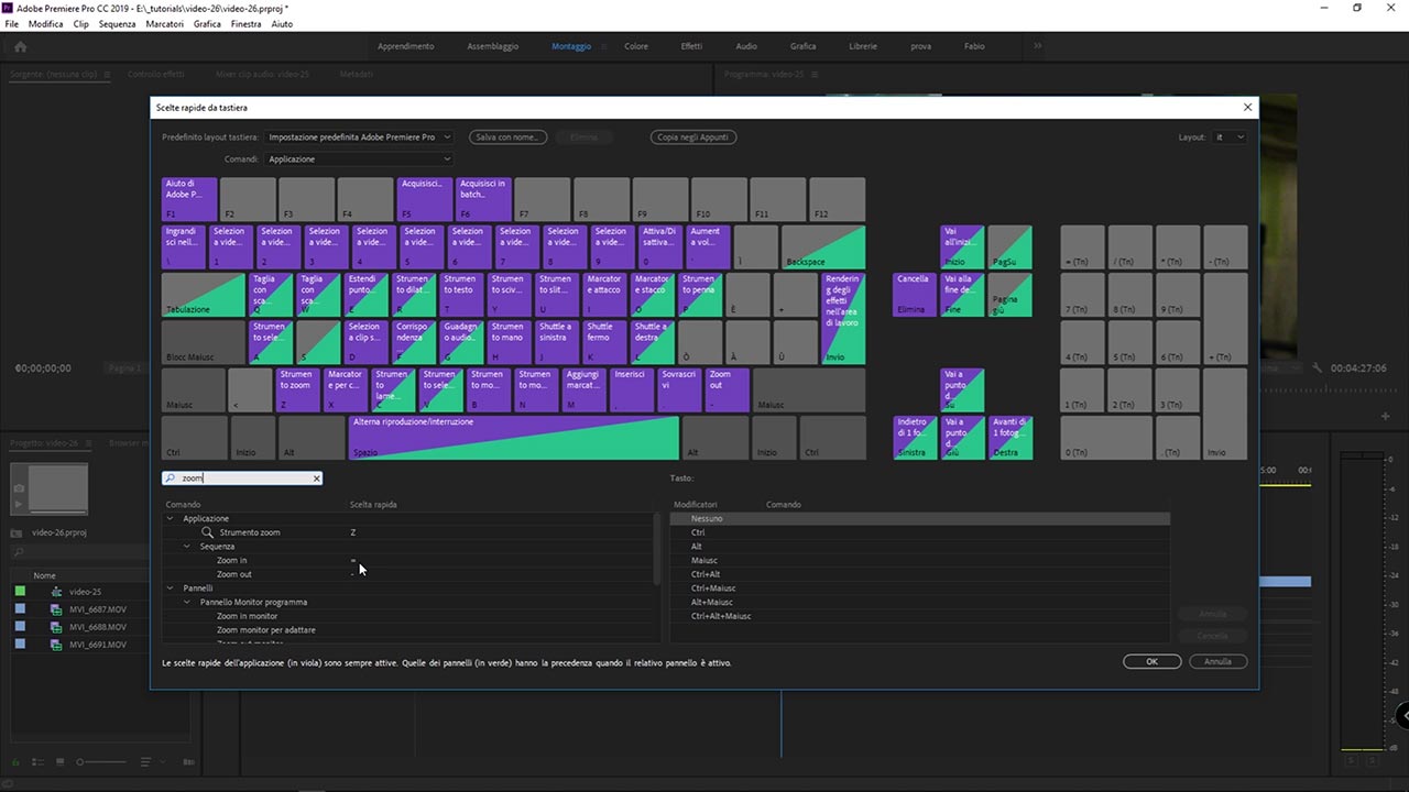 Come potete vedere ad ogni tasto è associata una funzione. Cerchiamo la funzione zoom nell’apposito campo di ricerca e associamo i tasti + per lo zoom in e – per lo zoom out. Quando abbiamo finito clicchiamo su OK per salvare la nuova configurazione. In questo modo potremo zoommare a piacimento dentro la sequenza e ingrandire gli elementi multimediali che stiamo lavorando. Una spiegazione più pratica e una dimostrazione è disponibile nel tutorial video associato a questa lezione!